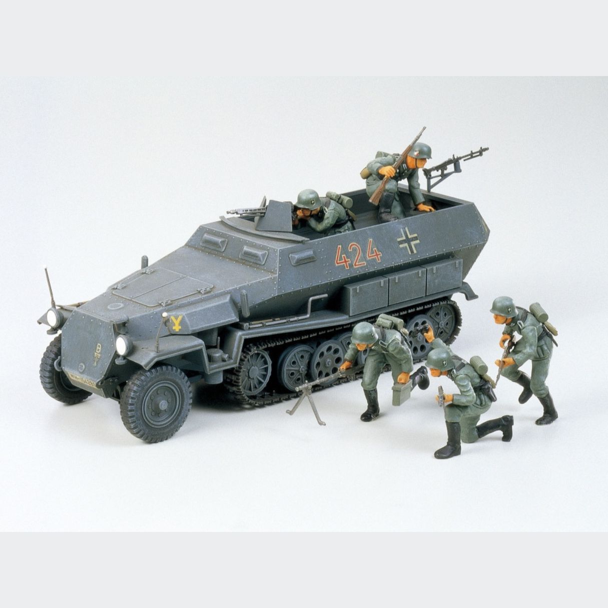 El Sd.Kfz.251 pertenecía al arsenal de vehículos semioruga utilizados por la Wehrmacht durante la Segunda Guerra Mundial. Su producción comenzó en 1937, y las primeras variantes “A” estaban propulsadas por un motor de seis cilindros en línea de 4171 cc y 100 CV. Su sistema de orugas ofrecía una gran ventaja en terrenos irregulares, y podía transportar hasta diez soldados o, con igual eficacia, remolcar cañones y otros remolques. Estuvo presente durante la invasión de Polonia en 1939 y demostró inmediatamente su efectividad en los tan aclamados ataques rápidos alemanes. Se fabricaron numerosas variantes, incluyendo versiones con cañones antitanque, y su producción alcanzó los 16 000 vehículos al final de la guerra en 1945, contribuyendo en todos los frentes a las fuerzas alemanas asediadas.