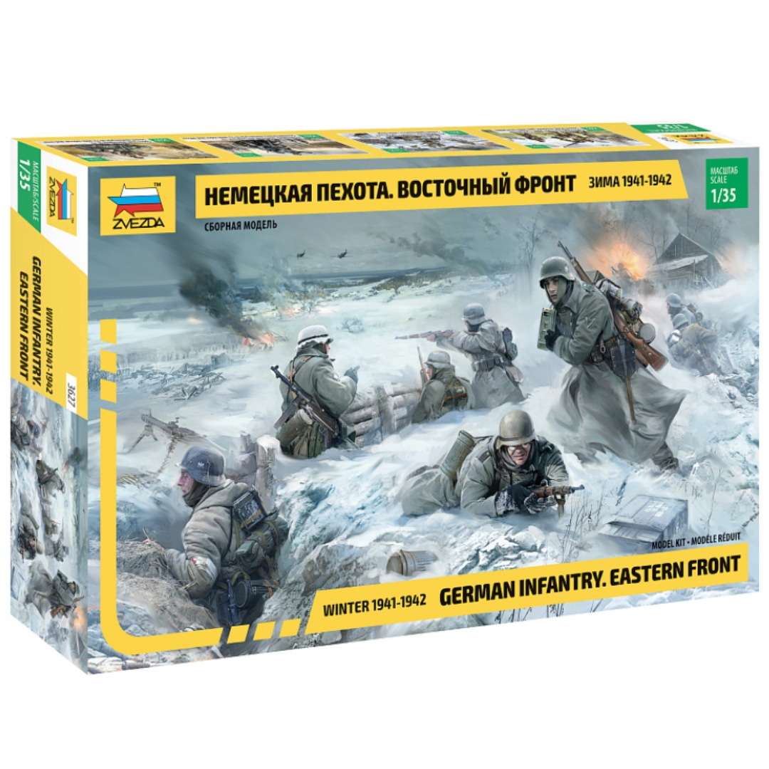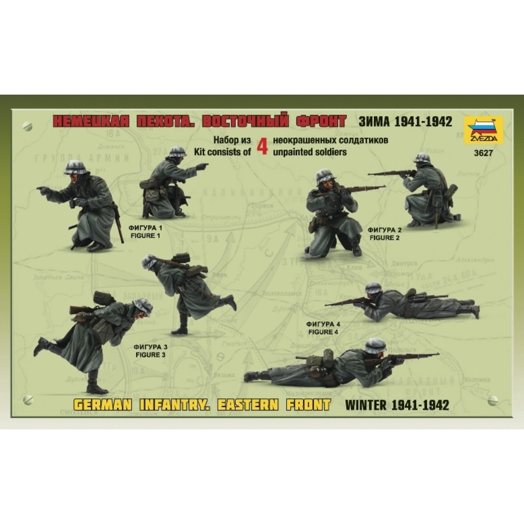 Este kit incluye 4 figuras de infantería de la Wehrmacht con uniformes del invierno de 1941-42, armados con subfusiles MR-38 y fusiles Karabiner 98. Un soldado lleva munición para mortero de 50 mm.